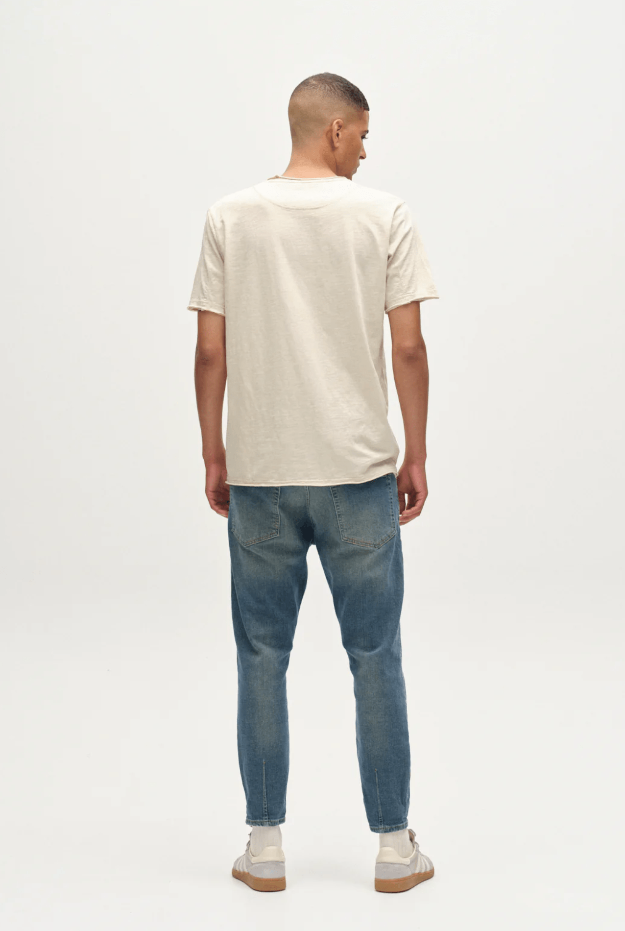 Relaxed tapered jeans with stretch comfort and vintage soul. The Alex Ulio in Mid Blue Denim features a relaxed upper block and a gently tapered leg for a modern, balanced silhouette. The soft, slightly tinted worn wash adds depth and character — ideal for effortless styling across seasons. Built for movement, designed for modern denim lovers.