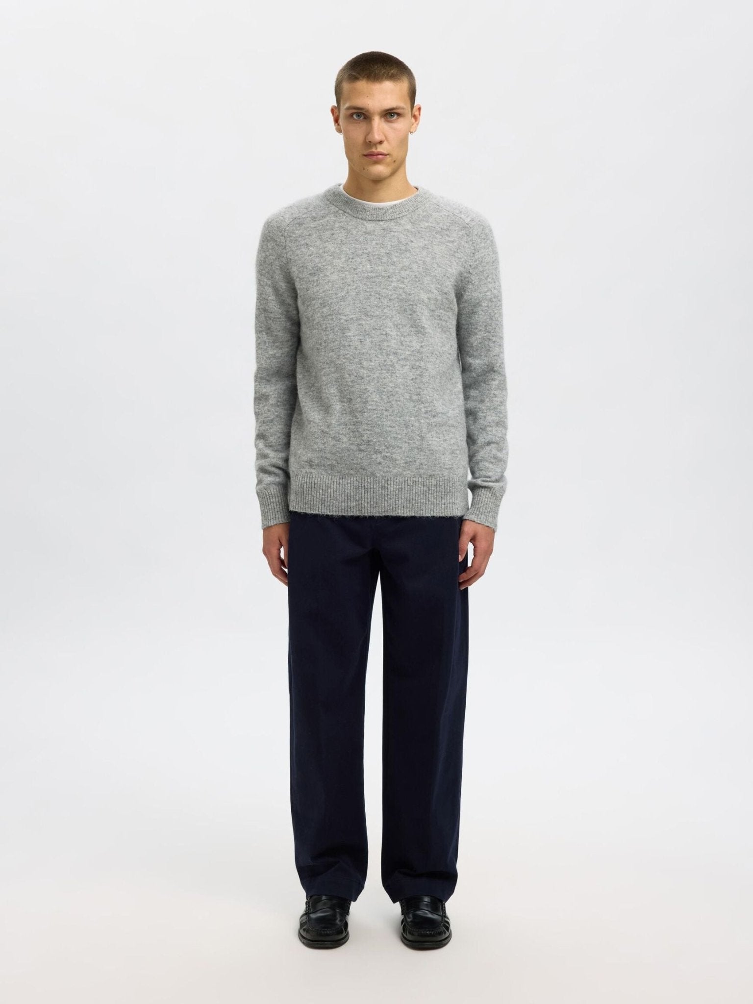 A refined essential for any wardrobe, this long-sleeved knitted jumper combines understated elegance with everyday comfort. The relaxed crewneck and distinctive raglan sleeves create a flattering silhouette, while ribbed detailing at the cuffs and hem ensures a polished finish. Crafted from luxurious alpaca wool and tailored to a regular fit, it transitions seamlessly from layering piece to standalone statement. Perfect paired with tailored trousers and leather loafers for a sophisticated office aesthetic, or dressed down with denim for effortless weekend style.
