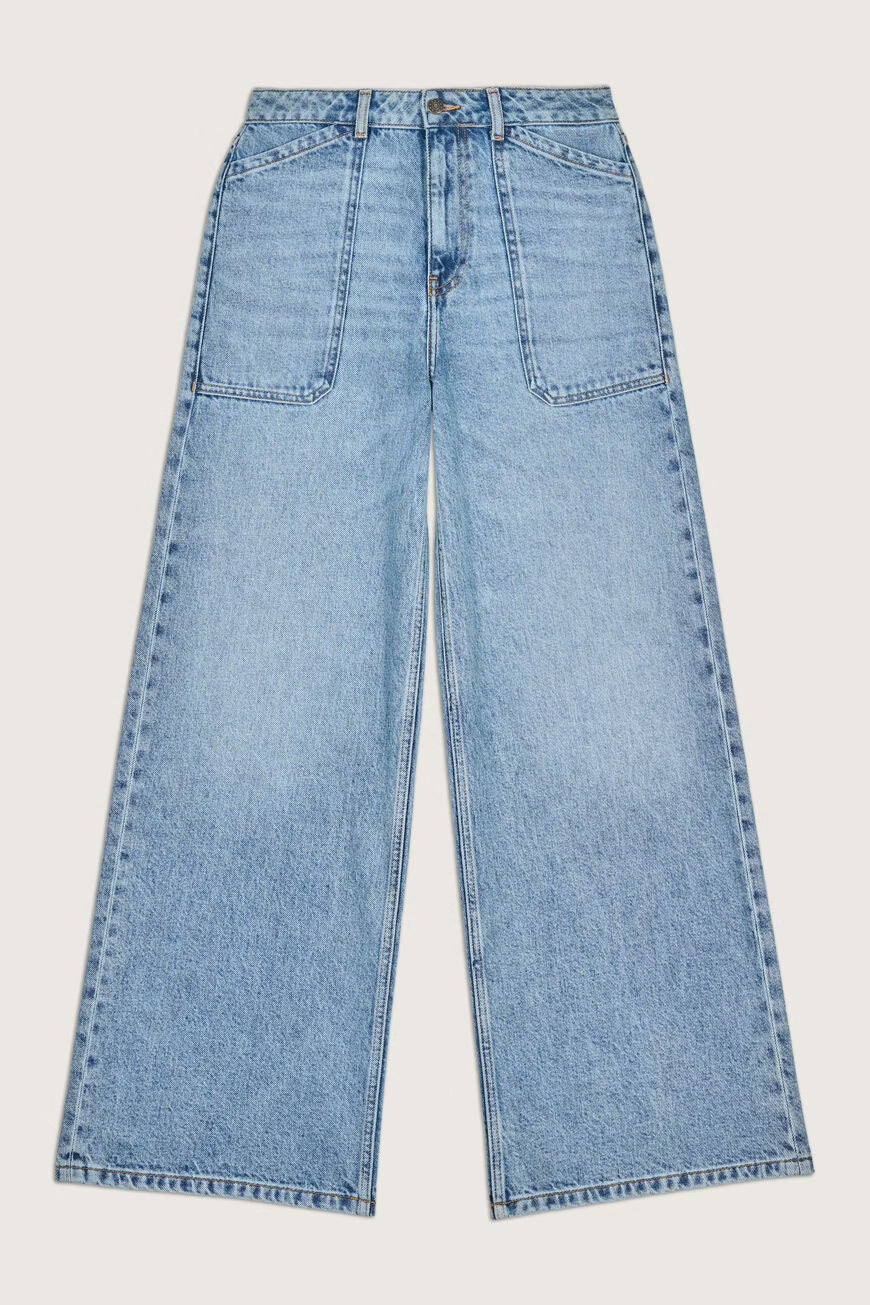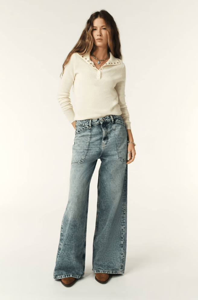 Channel 70s nostalgia with the ba&sh MELLOU wide leg flare jeans, a refined interpretation of vintage workwear heritage. Featuring a high-rise cut and generously proportioned flared silhouette, these jeans offer an elongated, commanding presence. The non-stretch fabric delivers a structured, authentic feel reminiscent of classic workwear, while substantial front patch pockets provide both practicality and distinctive visual interest. Ideal for those drawn to timeless denim with genuine character and an effortlessly polished aesthetic.