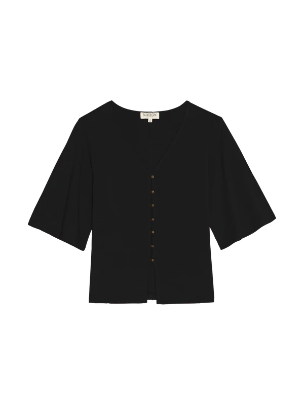 The Gisela Half Sleeve Top embodies refined femininity through carefully considered design elements. Constructed from pure cotton in Nation's signature silhouette, this piece features a graceful V neckline, delicate flutter sleeves, and strategic seaming that creates subtle shaping. Accented with gold hardware details, it transforms an everyday essential into something distinctly elegant—a versatile foundation piece that elevates any ensemble with understated sophistication.