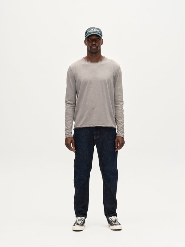 This refined long-sleeve tee showcases a relaxed silhouette crafted from substantial slub jersey, distinguished by artfully exposed seams and signature flatlock detailing throughout. The thoughtful construction delivers both visual interest and tactile appeal, making it an effortless addition to any wardrobe.