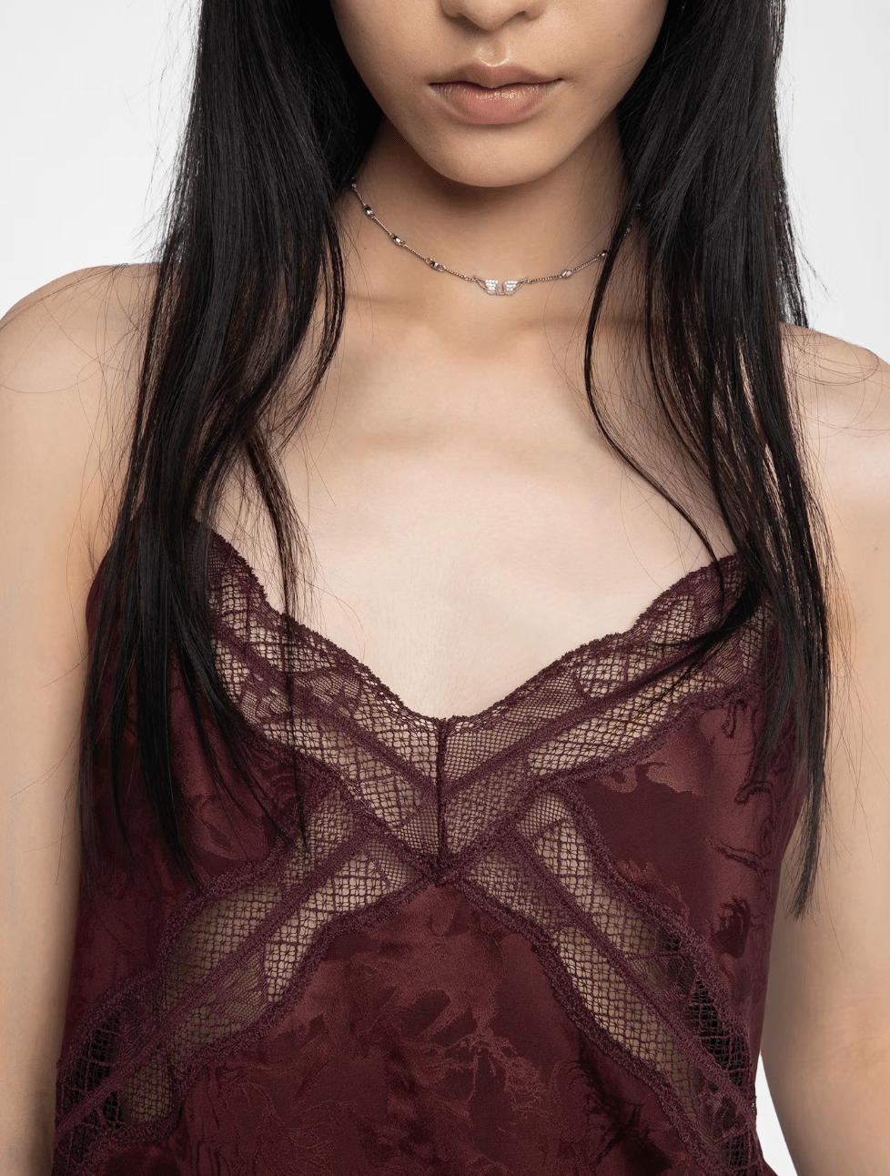 Elevate your wardrobe with this exquisite silk caraco from Zadig & Voltaire. Crafted entirely from luxurious silk with an intricate jacquard horse motif, this piece features a flattering V-neckline and adjustable straps for a personalized fit. The back showcases delicate French lace and embroidered wings, created exclusively by the renowned Sophie Hallette. A refined blend of timeless elegance and contemporary design.