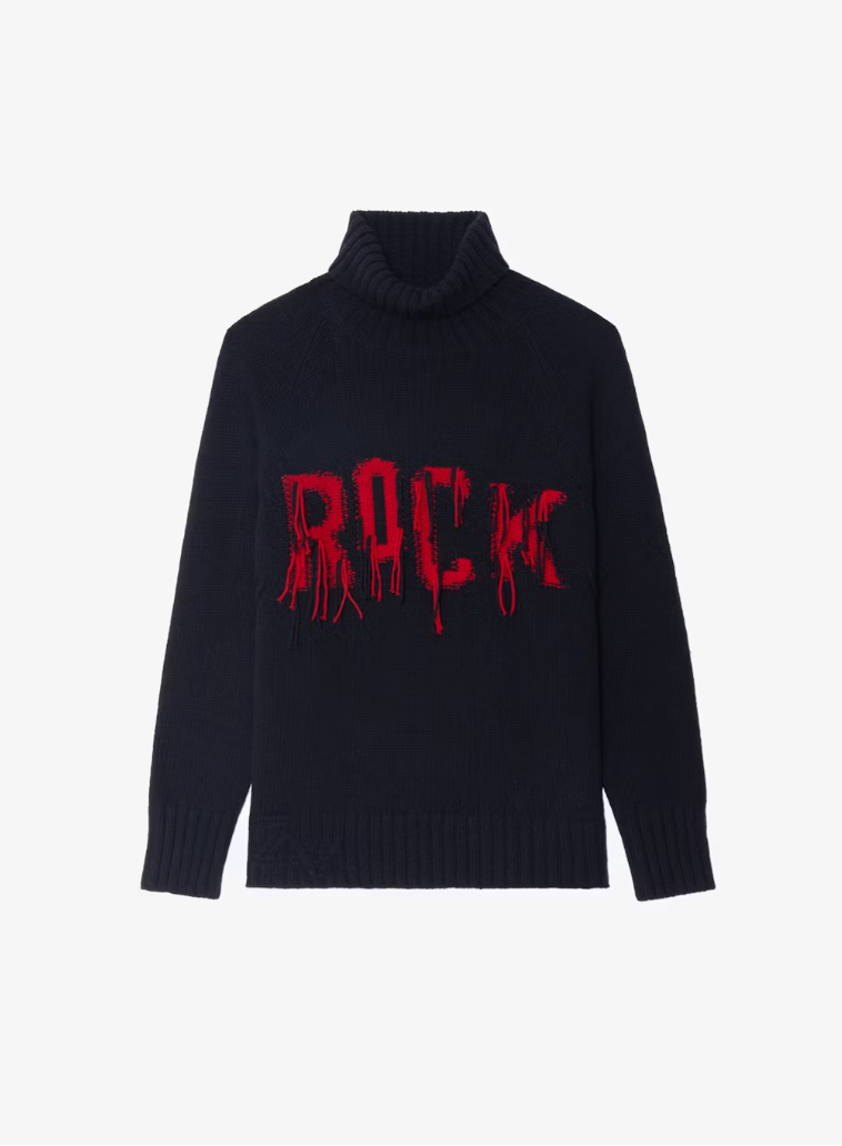 Crafted from pure merino wool, this sophisticated pullover showcases an elegant embroidered rock design on the front. The structured mock neck and full-length sleeves create a polished silhouette perfect for layering or wearing solo. A refined wardrobe staple that combines understated luxury with contemporary style.