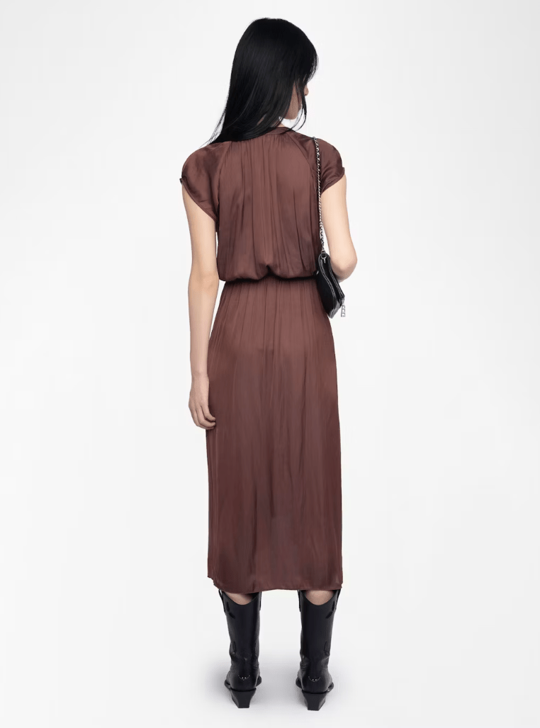 This mid-length satin dress from ZADIG & VOLTAIRE embodies contemporary sophistication. Featuring a refined V-neckline and comfortable raglan short sleeves, the design is elevated by an asymmetrical ruffled skirt that introduces graceful movement. The sumptuous satin fabric creates a polished drape, making this piece an essential choice for elevated occasions and modern wardrobes.