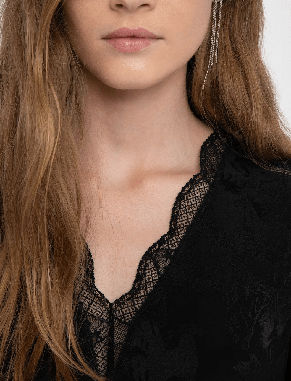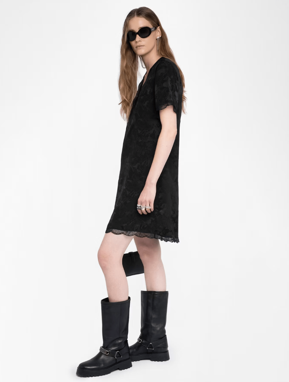 This refined short dress is constructed from pure silk with an exquisite jacquard weave depicting an equestrian motif. Designed with a lingerie-inspired aesthetic, it features a graceful V-neck, short sleeves, and exclusive French lace crafted by Sophie Hallette for Zadig&Voltaire. The removable belt cinches the waist for a customizable silhouette. An understated yet elegant piece perfect for elevating any wardrobe.