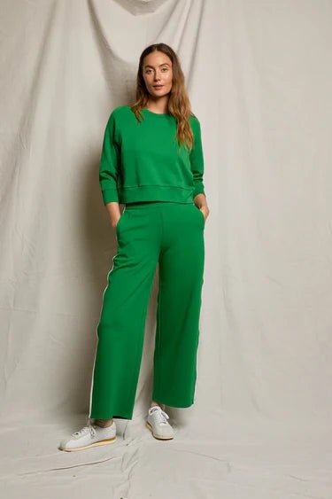 the mikos is a wide-leg pant designed with a clean silhouette and a sporty contrast stripe running down the side for a classic touch. crafted from a smooth pureform knit that never wrinkles, it offers the comfort of your favorite lounge set while maintaining a polished look that’s ready for the airport or a long day out. pair it with the Nell sweatshirt for an easy travel set you can throw on without a thought.