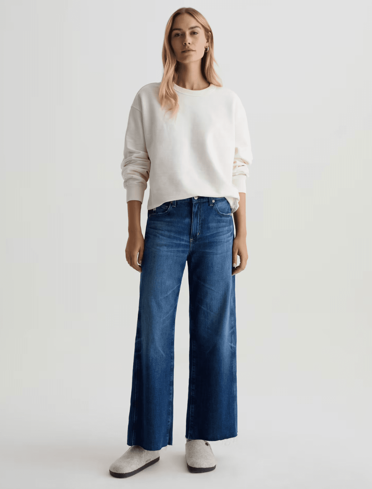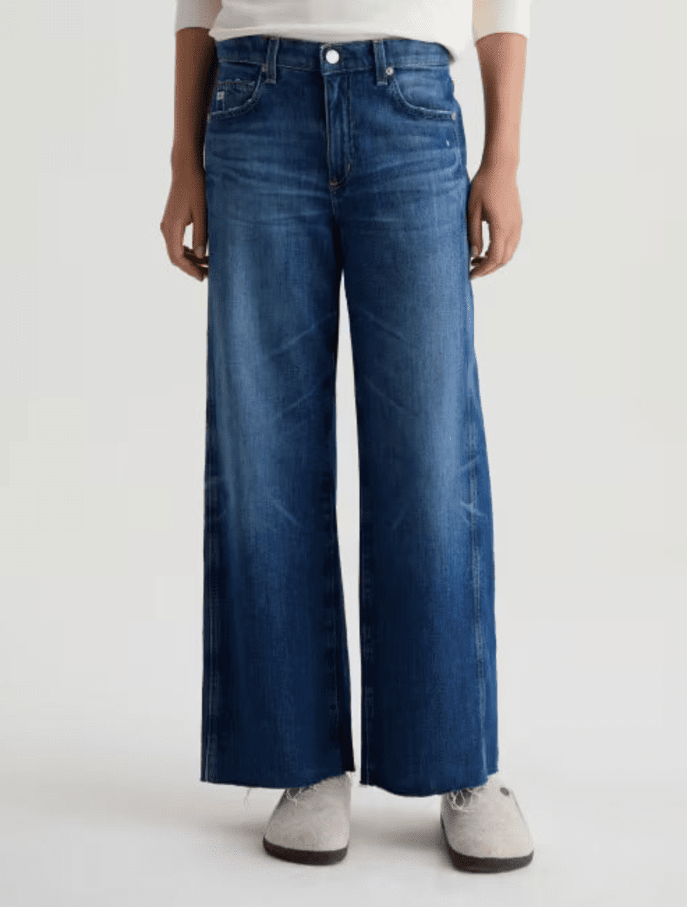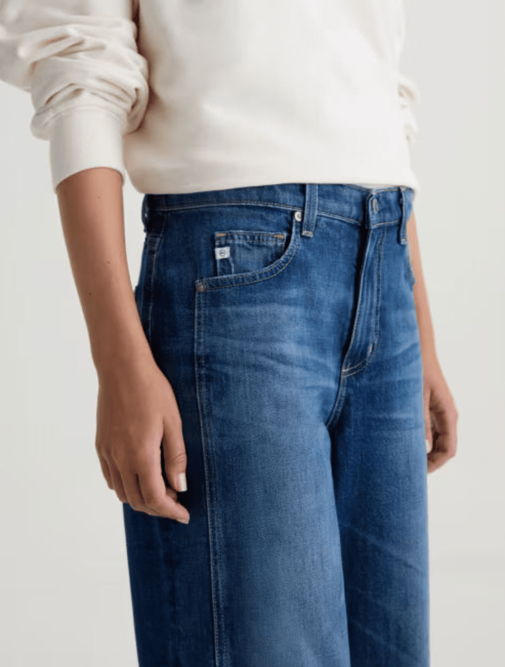 Le jean Saige Wide Leg Crop est confectionné en denim stretch Journey Comfort de la célèbre filature italienne Candiani. Ce jean taille mi-haute est apprécié pour sa coupe décontractée et sa jambe raccourcie. Il est revisité avec un ourlet et des empiècements latéraux francs qui se raccordent aux poches, lui conférant un aspect à la fois usé et épuré. Ce modèle présente des effets de délavage, de moustaches et de finitions usées dans notre délavage bleu moyen Watermist.