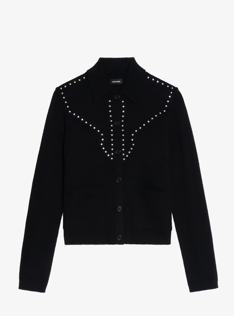 This ZADIG & VOLTAIRE cardigan combines luxurious comfort with contemporary style. Constructed from premium wool and cashmere, it showcases an elegant shirt collar and striking metallic stud accents that add visual interest. The button-front fastening, functional patch pockets, and extended sleeves deliver both practicality and refined aesthetics. A versatile layering essential that seamlessly complements any sophisticated wardrobe.